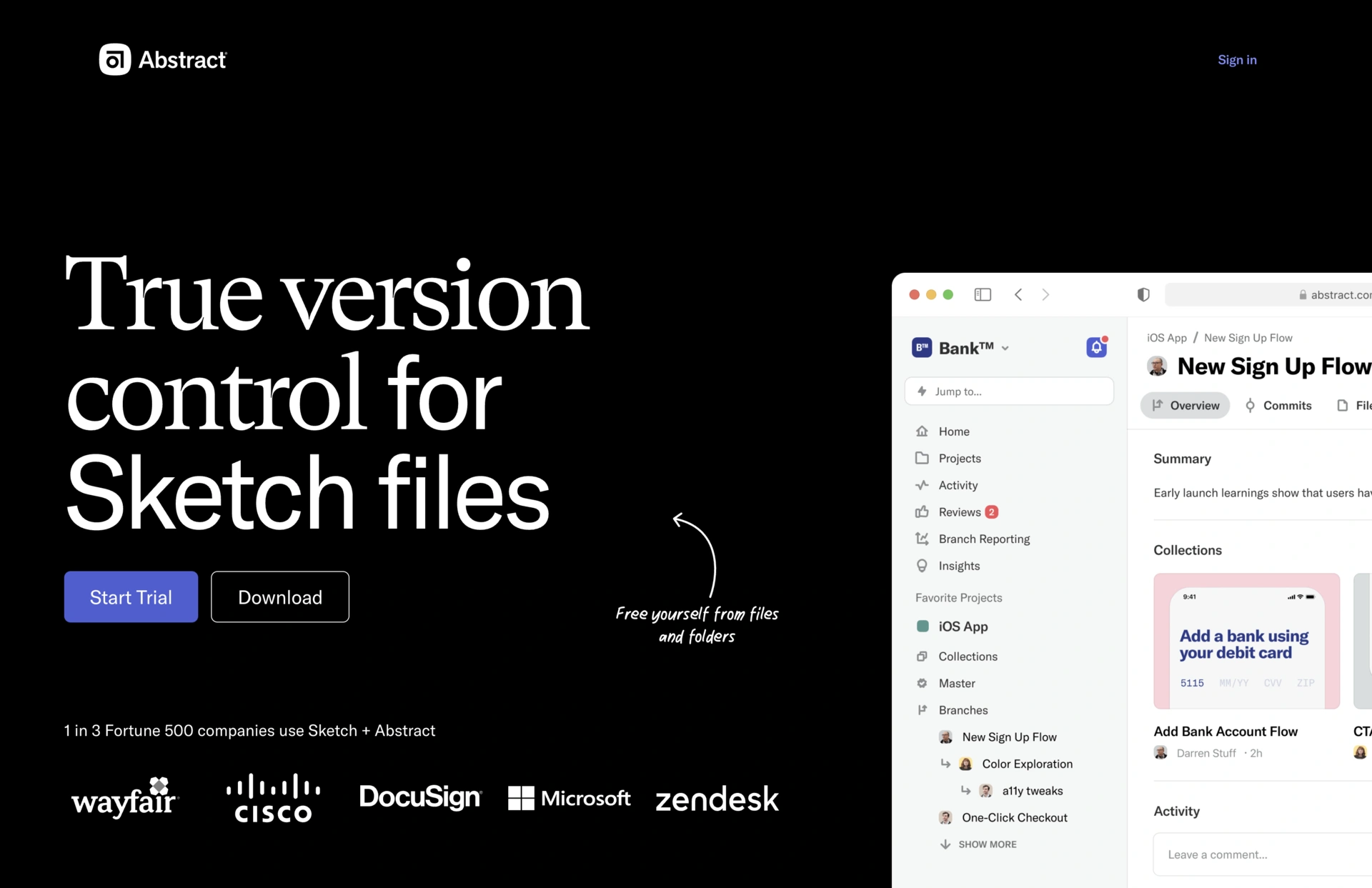 The design of Abstract's website is sleek and professional, aimed at design professionals. It emphasizes their version control tool for Sketch, showcasing features through clean layouts and concise descriptions. The site uses a combination of striking visuals and straightforward text to highlight the benefits of their product, creating a user-friendly experience. The overall aesthetic is modern and aligns well with their target audience of designers and creatives.
