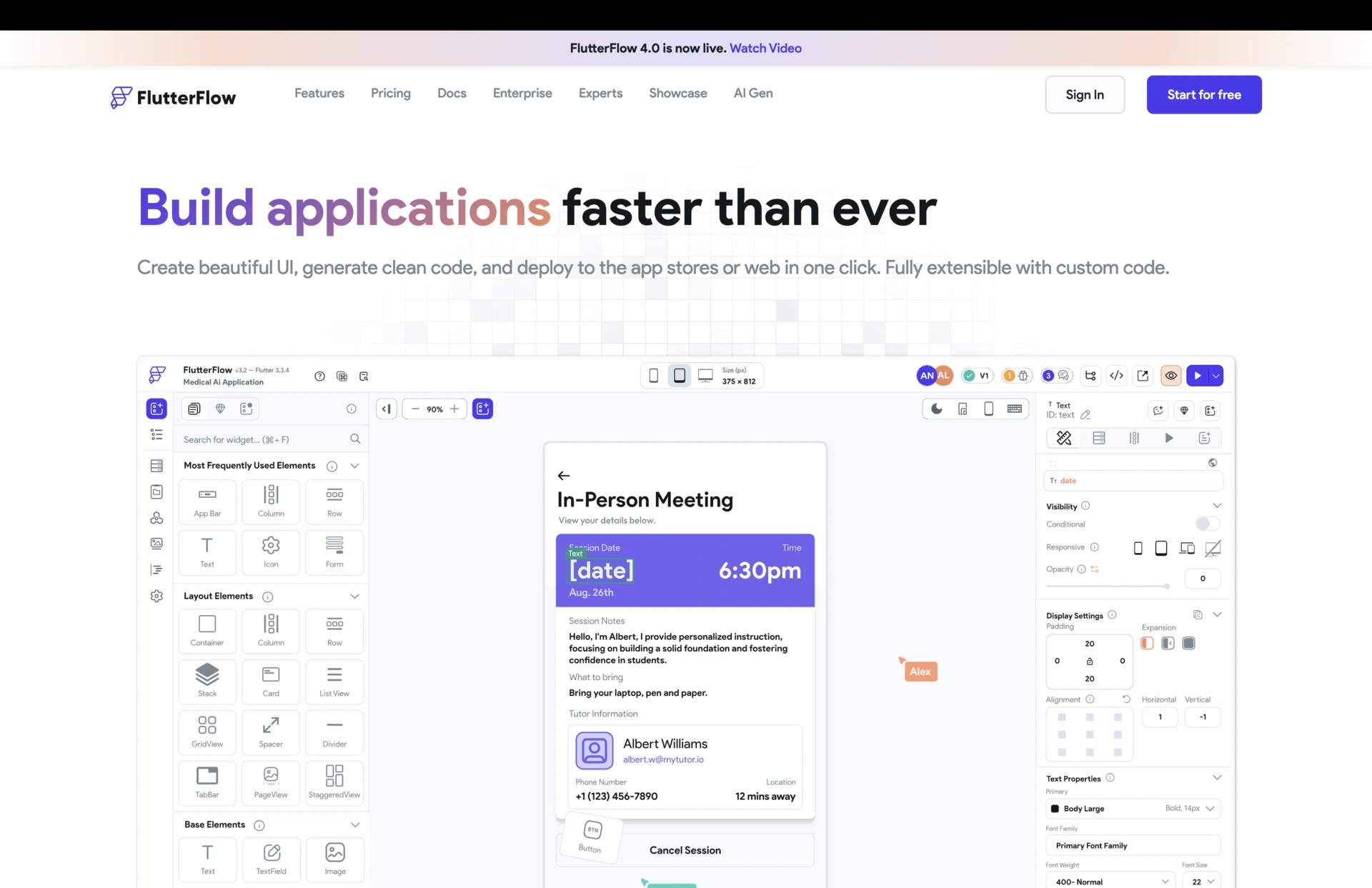 The FlutterFlow website features a modern and user-friendly design, emphasizing the ease and efficiency of building apps with their platform. It showcases vibrant visuals and a clear, concise layout, highlighting key features like the drag-and-drop UI builder, Firebase integration, and custom code capabilities. The site effectively communicates the platform's versatility and power, appealing to both non-technical users and professional developers. Testimonials and examples of apps built using FlutterFlow add credibility and illustrate the platform's practical applications.