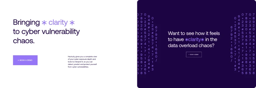 - Clear, crisp headline with the core outcome that Hackuity can bring to an enterprise. There is no compromise on using a jargon, however it isn't alienating.